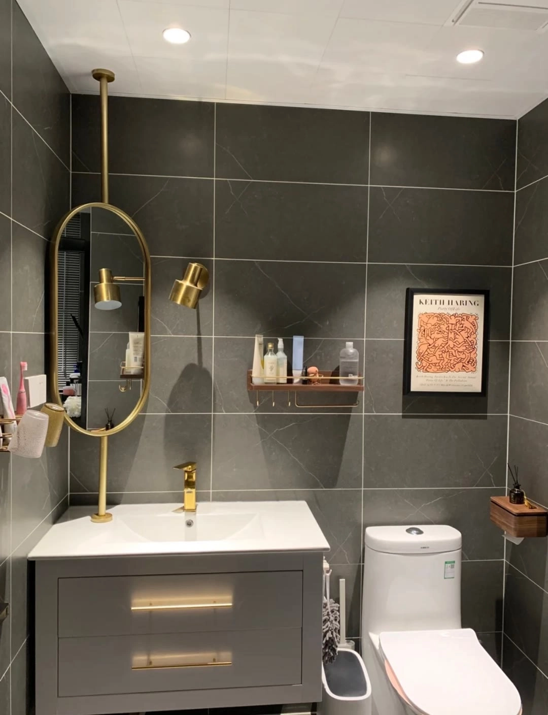 | Luxe Contemporary | Smoked eucalyptus | Deep emerald + gold veins | Integrated backlit mirror |