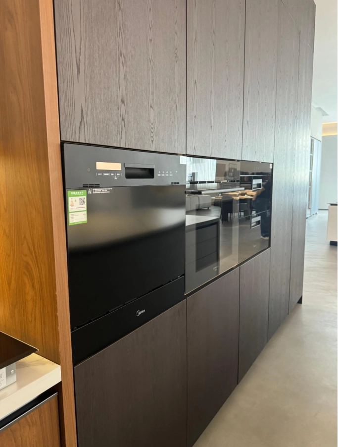 Discover the Komox walnut and black melamine finish kitchen cabinet. This modern melamine kitchen cabinet features a luxurious walnut finish, combining style and durability. Upgrade your space with our walnut finish kitchen cabinet for a sleek, timeless look.