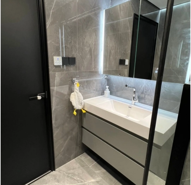 | Luxe Contemporary | Smoked eucalyptus | Deep emerald + gold veins | Integrated backlit mirror |