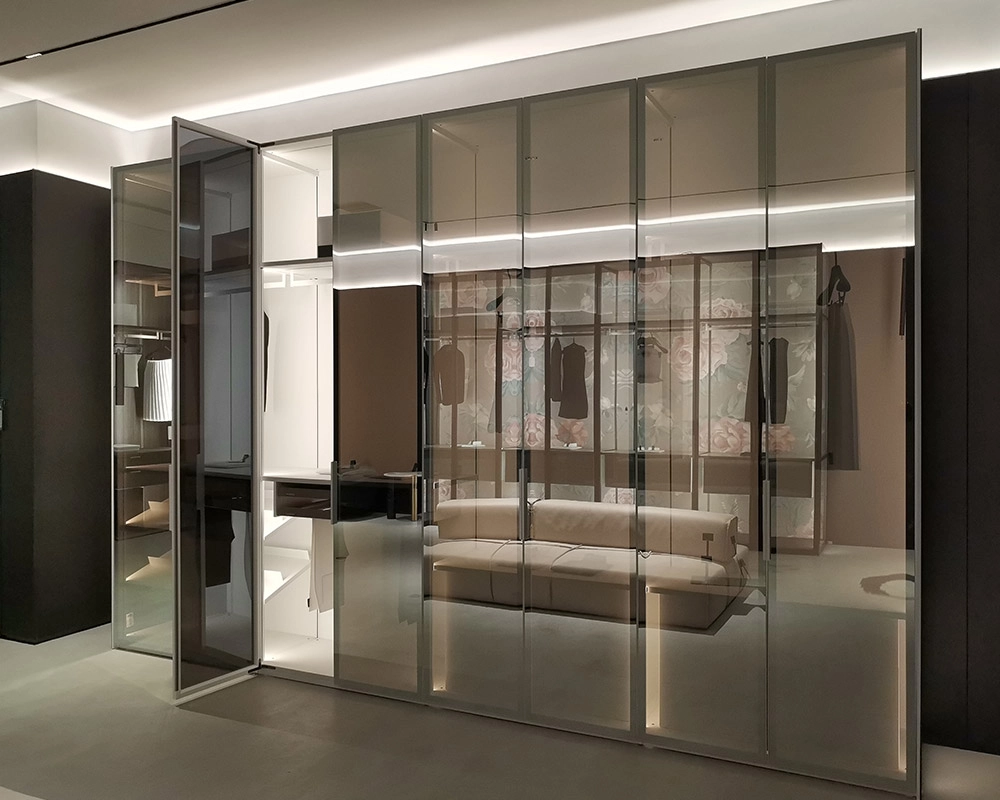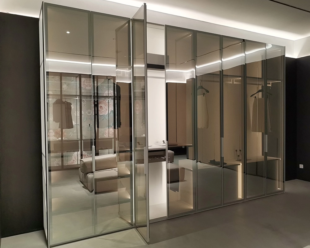 Glass and wood wardrobe cabinets elegantly blend functionality and style for bedrooms or dressing rooms. The wooden frames offer durable sophistication, while glass panels provide easy visibility of contents, simplifying organization.